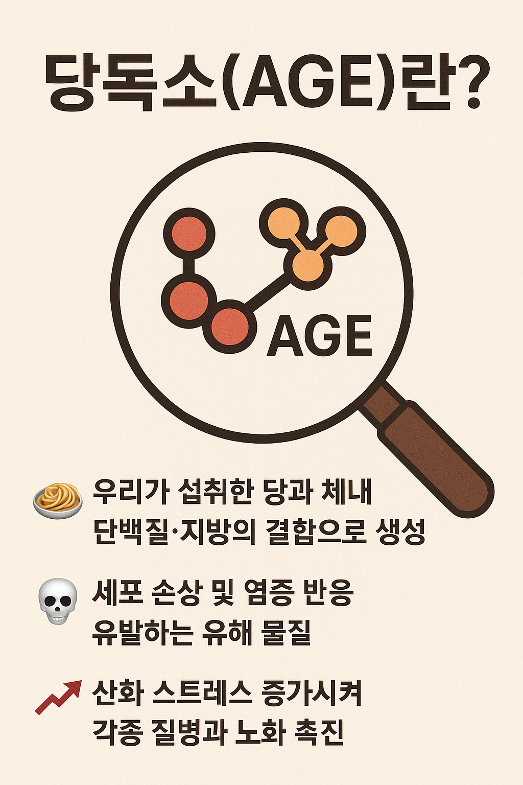 ‘당독소’라는 말을 들어본 적 있나요? 당독소는 'Advanced Glycation End Products', 줄여서 AGE라고 불리며, 우리가 일상적으로 섭취하는 음식 속 당분과 단백질, 지방이 체내에서 결합해 생성되는 유해한 물질입니다.