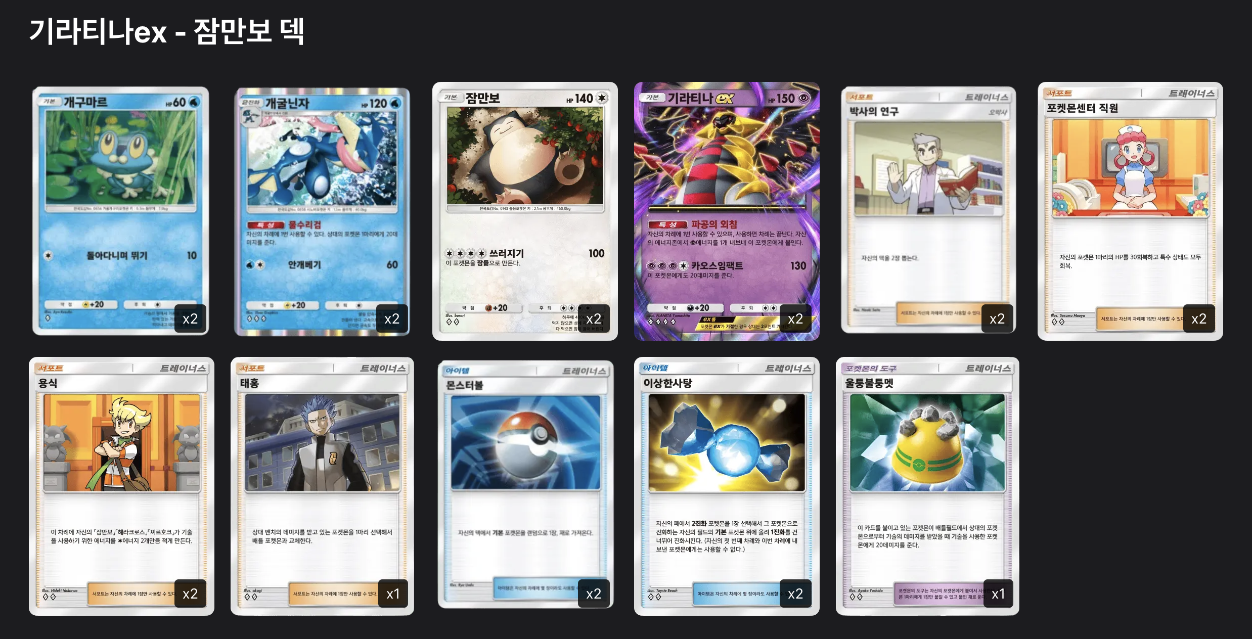 처음 잠만보를 낼 수 있으며, 벤치 포켓몬으로 기라티나 개구마르를 낼 수 있으면 최적의 조건이 완성된다.