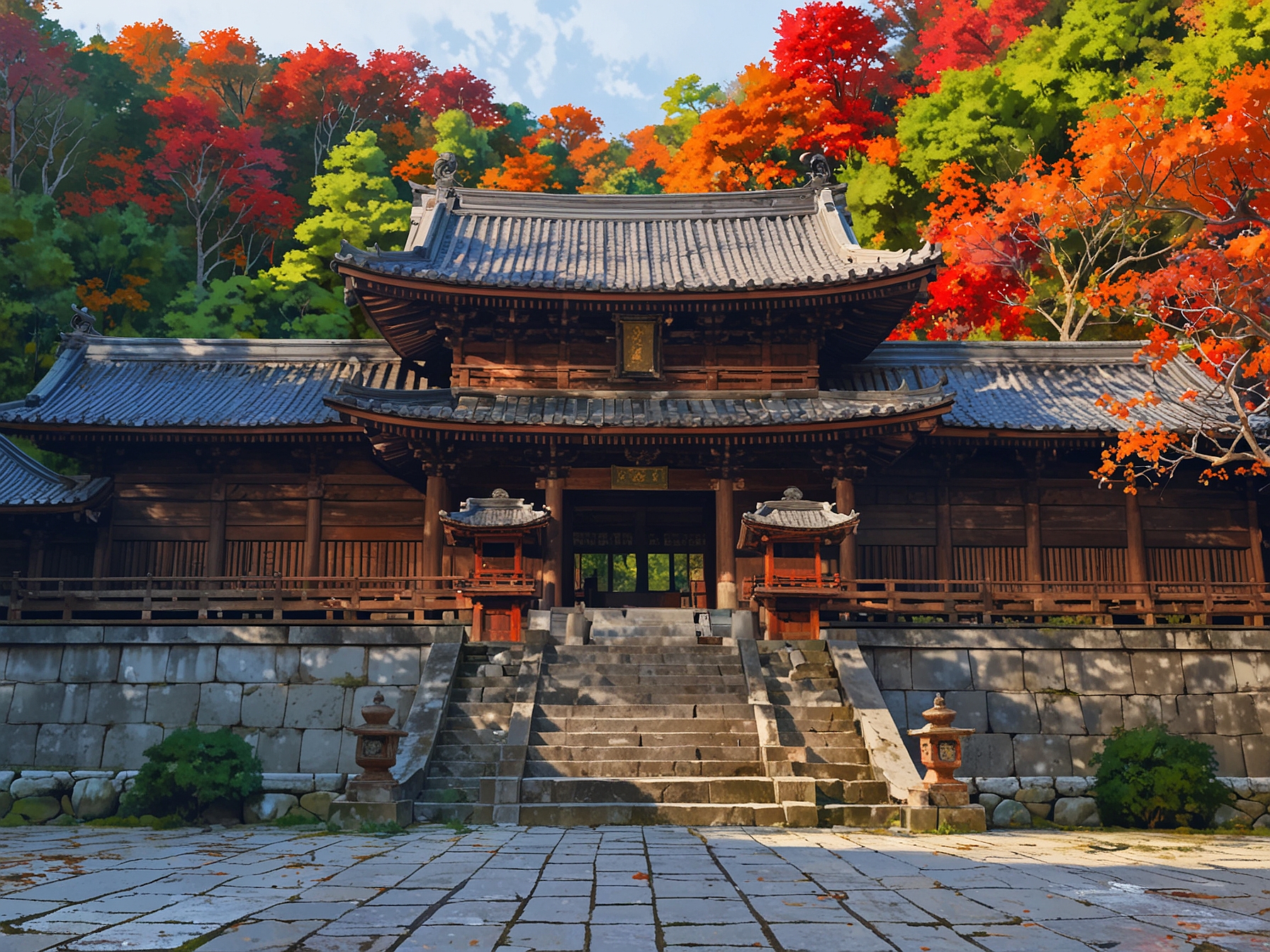 본당은 단순히 불상을 안치하는 공간이 아니라, 건축 자체로도 뛰어난 예술성을 자랑합니다. 길게 뻗은 건물은 마치 거대한 용이 웅크리고 있는 듯한 인상을 주며, 섬세한 목조 조각과 화려한 채색은 보는 이의 시선을 사로잡습니다. 특히, 지붕의 곡선미와 처마의 장식은 일본 건축의 아름다움을 잘 보여주는 요소입니다.